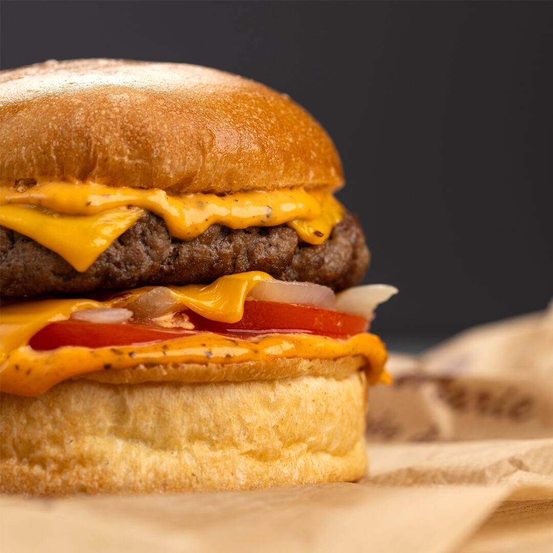 Agrémenté d’un savoureux steak haché de bœuf, de crudités, de cheddar en tranche, le tout enrobé d’une onctueuse sauce burger !