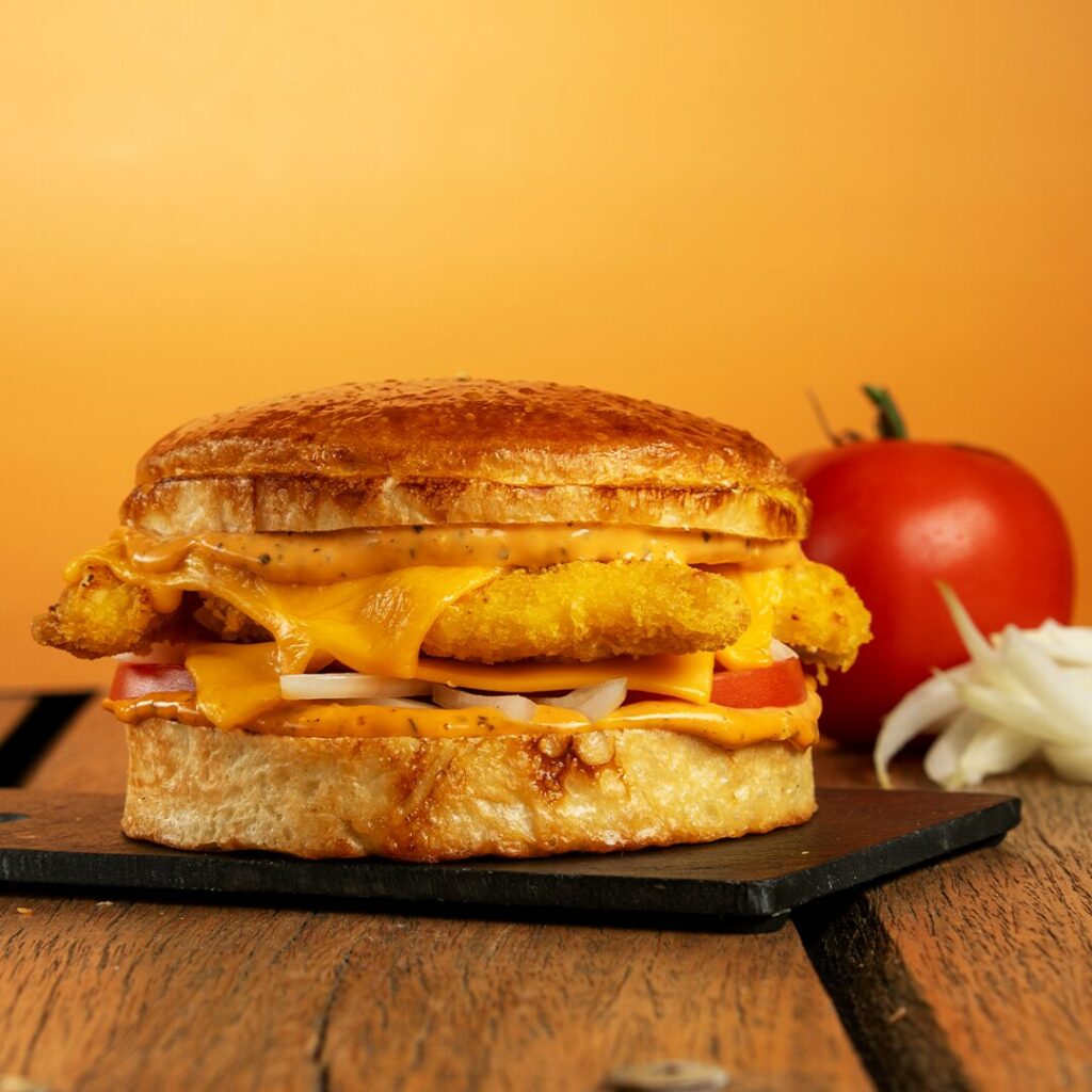 Le poulet, doré et croustillant à souhait, se marie parfaitement au cheddar fondant qui apporte douceur et onctuosité. Les tomates fraîches et les oignons apportent fraîcheur et croquant, tandis que la sauce burger enveloppe le tout d’une saveur riche et gourmande.🍔🍅🧀