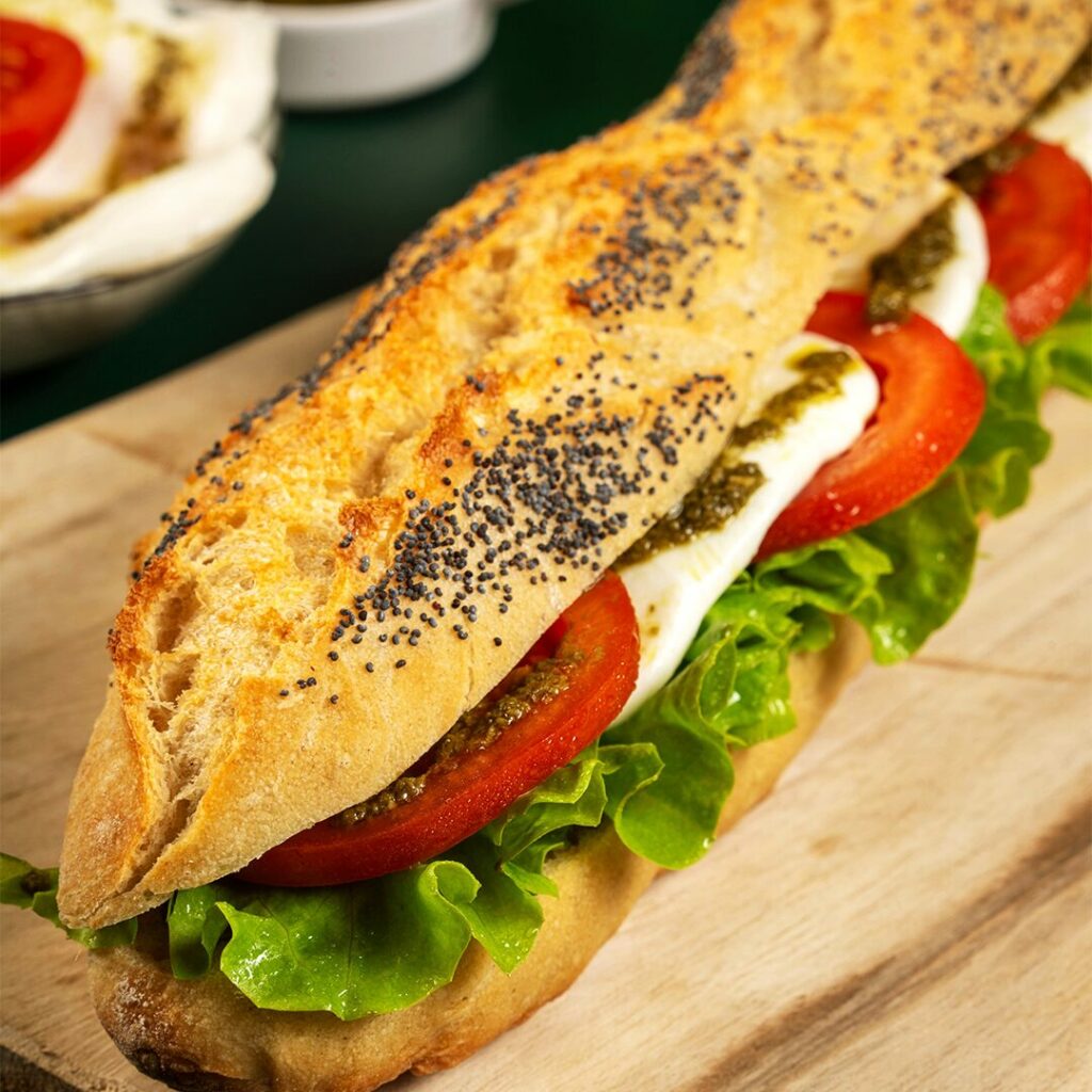 Le tout est sublimé par un pesto, qui enveloppe le sandwich d’une touche herbacée et savoureuse.  😋